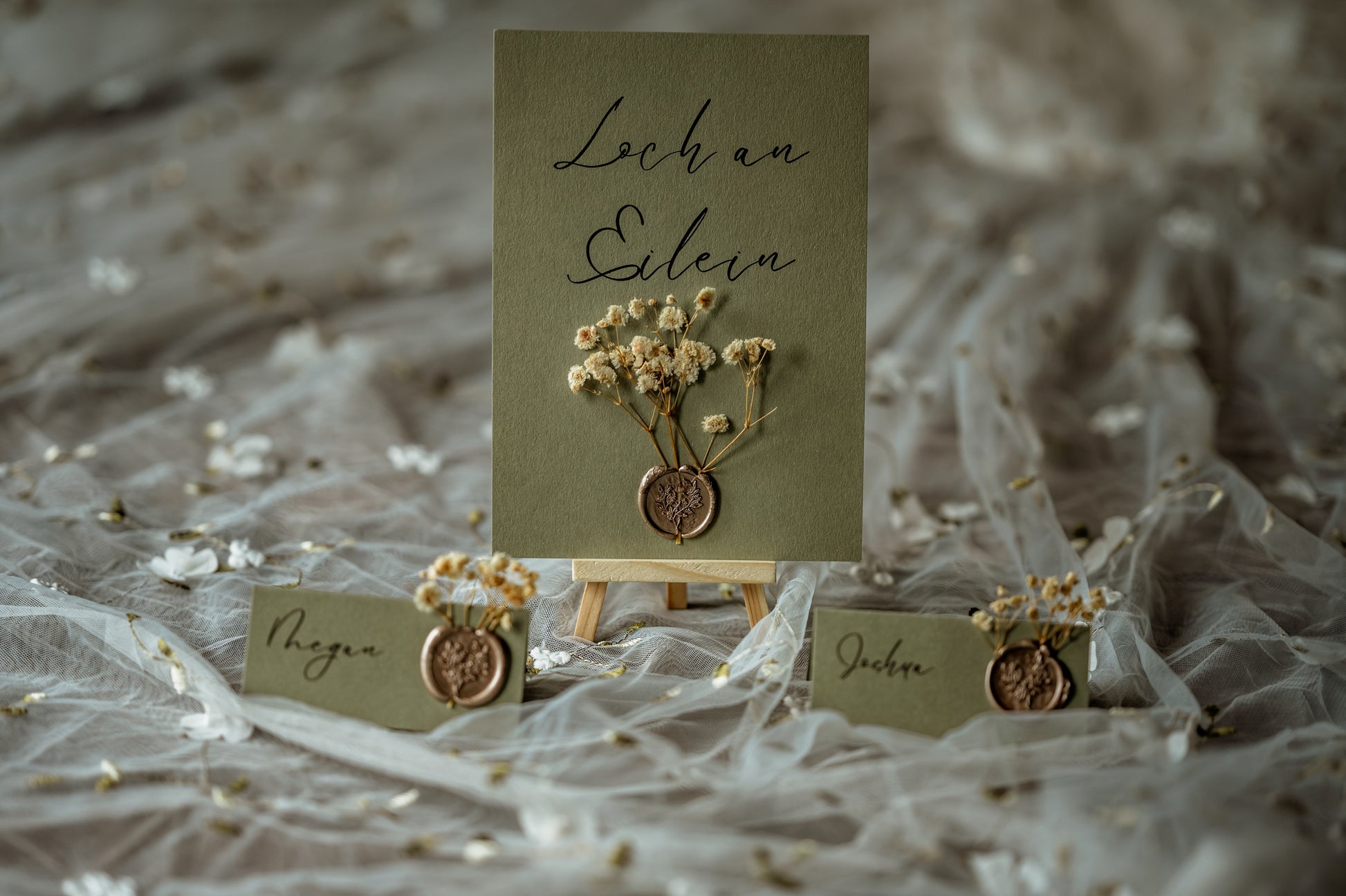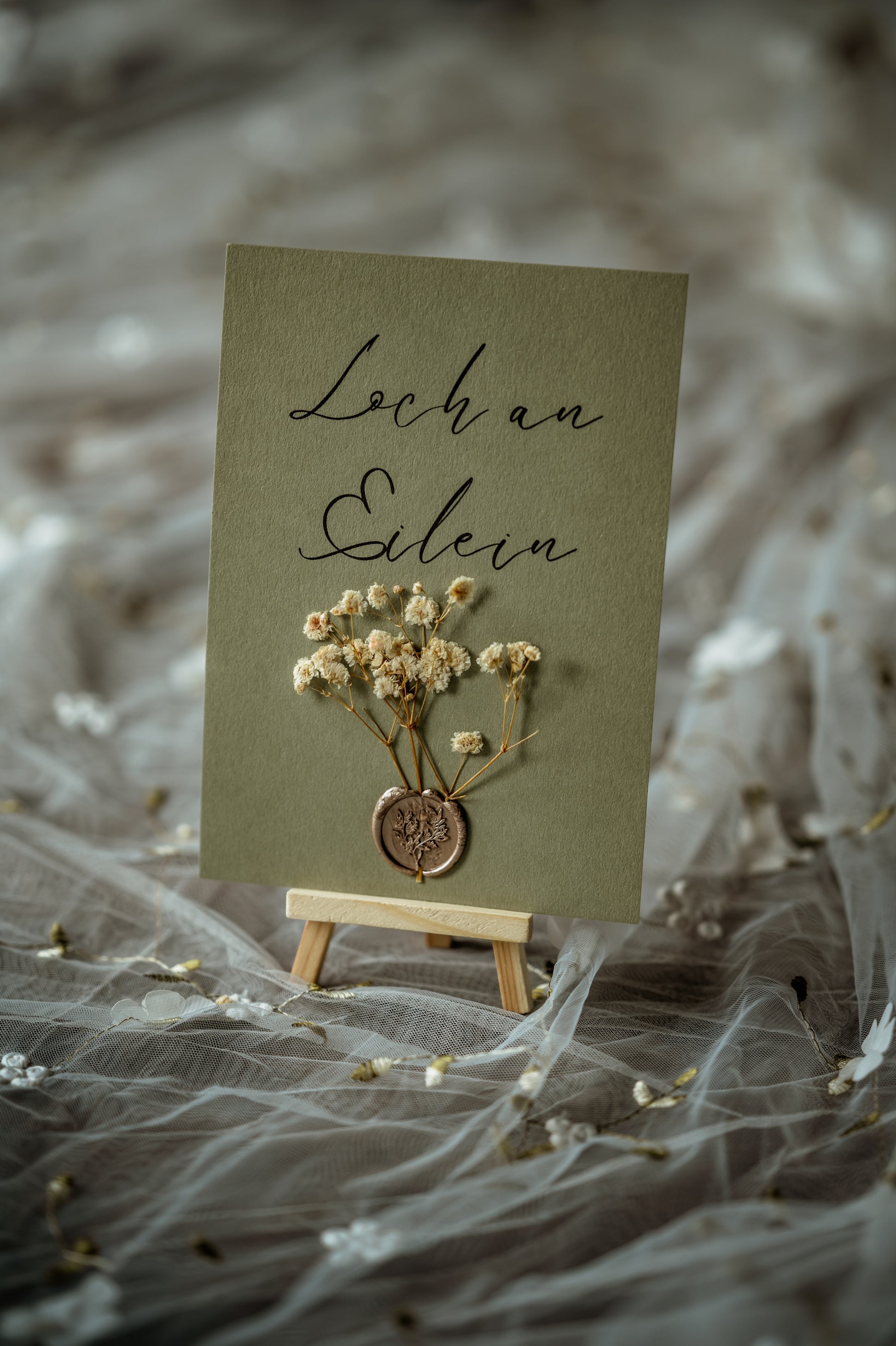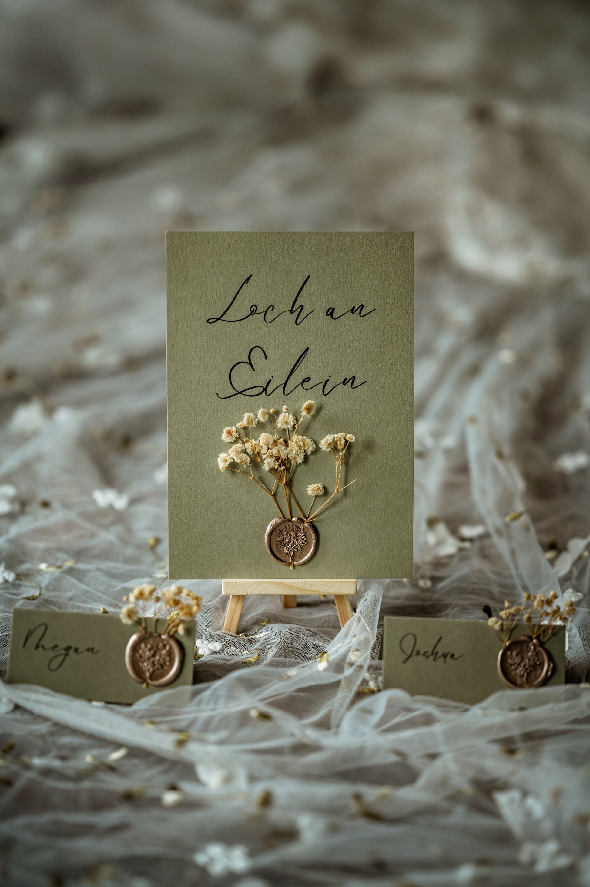 Table Sign: sage/moss green with black printed text, finished with dried gypsophila and a champagne gold wax seal. Sign measures A5 (14.8 x 21 cm).