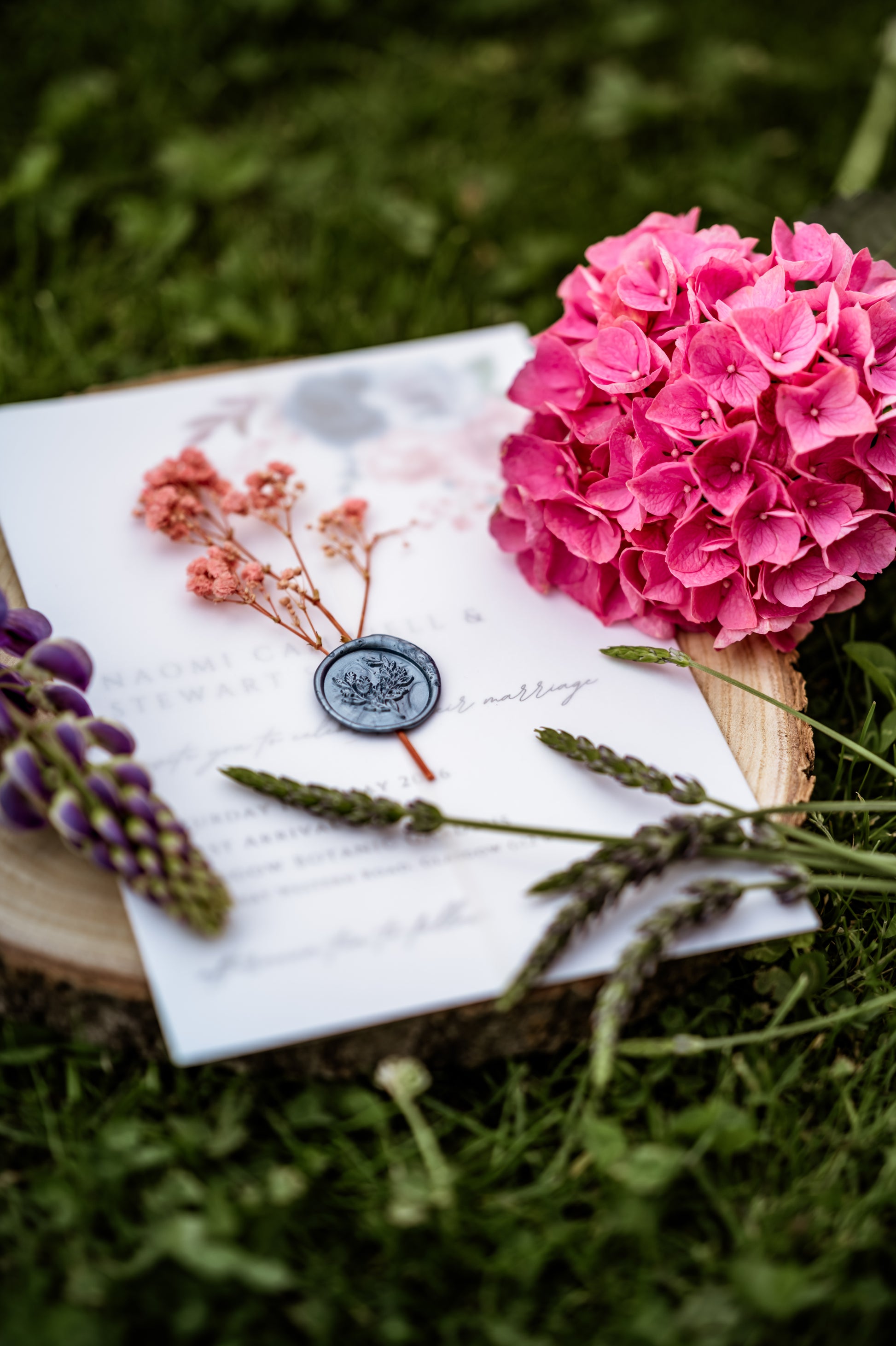 This invitation set is beautifully finished with a luxury-feel vellum wrap, a blue-silver floral wax seal, and pink dried gypsophila (baby's breath). A luxury white envelope is also included.